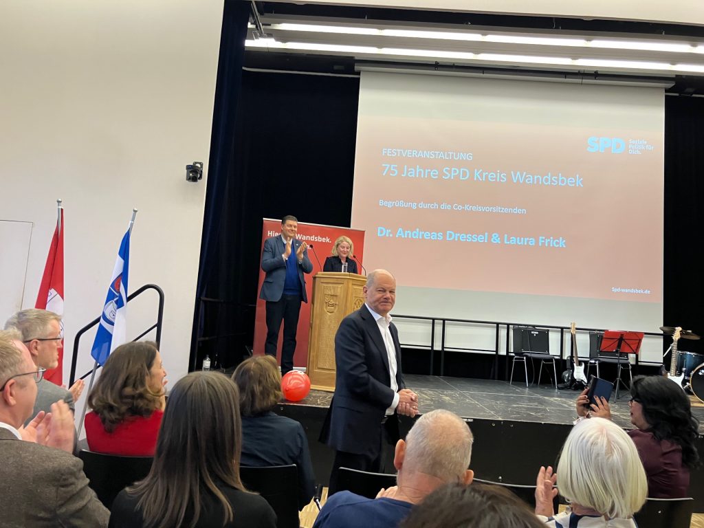 Die Festrede hielt der Bundeskanzler a.D. und frühere Erste Bürgermeister Olaf Scholz. Er selbst trat vor rund 50 Jahren in Rahlstedt in die SPD und Jusos ein. In seiner Rede erzählte er viel zur Geschichte des Kreises und seinen damaligen Eindrücken. Am Ende machte er den rund 200 anwesenden Genossinnen und Genossen Mut, sich den wichtigen Fragen der Zukunft zu stellen. Diese seien: